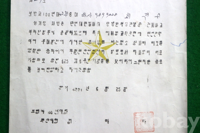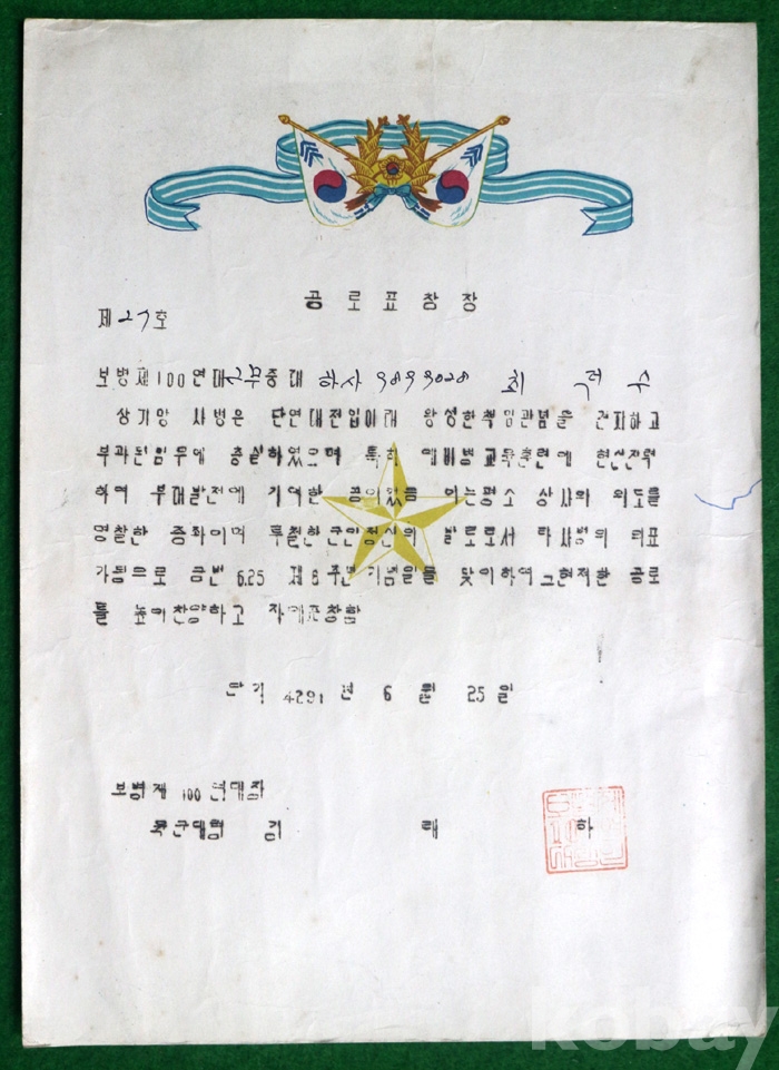 (상장 및 졸업장) 1958년 보병 제100연대장 김태하 대령이 준 공로표창장
