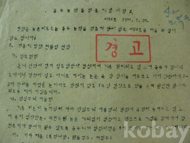 (경고) 금주 농작물 병충해 방제 정보 - 잎도열병, 잎집무늬 마름병 등 (1974년, 청양군 농촌지도소)
