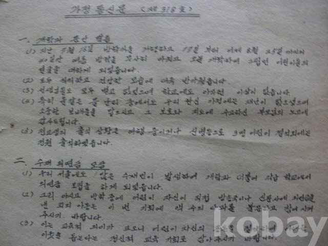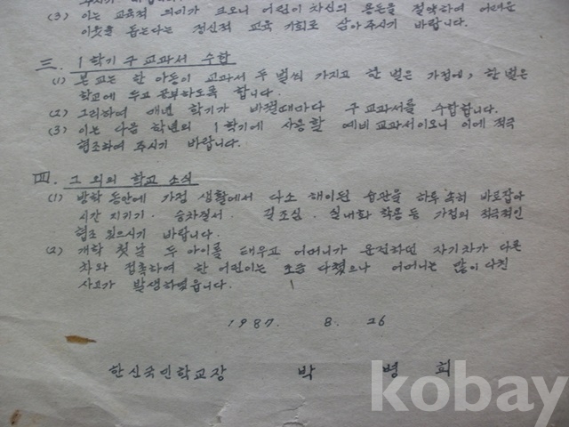 한신국민학교 가정 통신문 - 개학과 문안 말씀, 수재의연금 모금, 구 교과사 수합 등 (1987년)