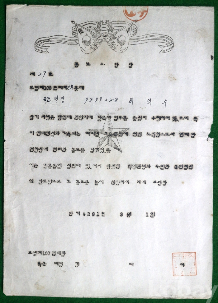(상장 및 졸업장) 1958년 보병 제100연대장이 준 공로표창장