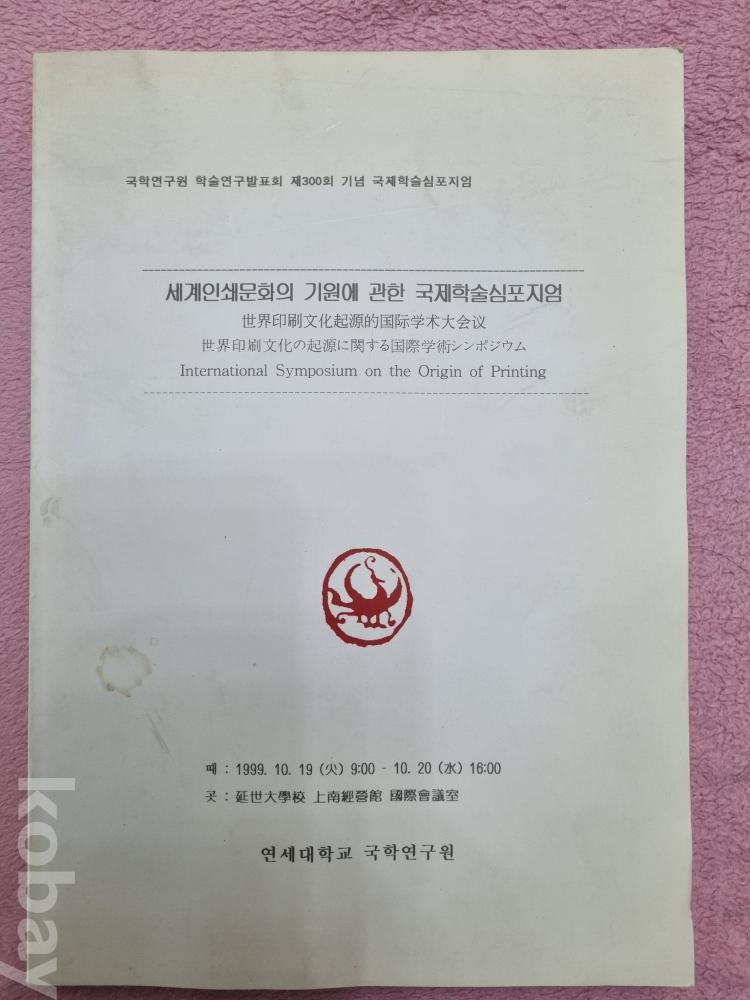 표제/저자사항세계인쇄문화의 기원에 관한 국제학술심포지엄 = International symposium on the origin of printing : 국학연구원 학술연구발표회 제300회 기념 국제학술심포지엄 / 연세대학교 국학연구원 [편]