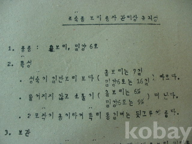 조숙종 보리종자 관리상 유의점 (올보리, 밀양6호) - 2모작이 용이하여, 특히 통일벼는 뒷그루에 좋다 등