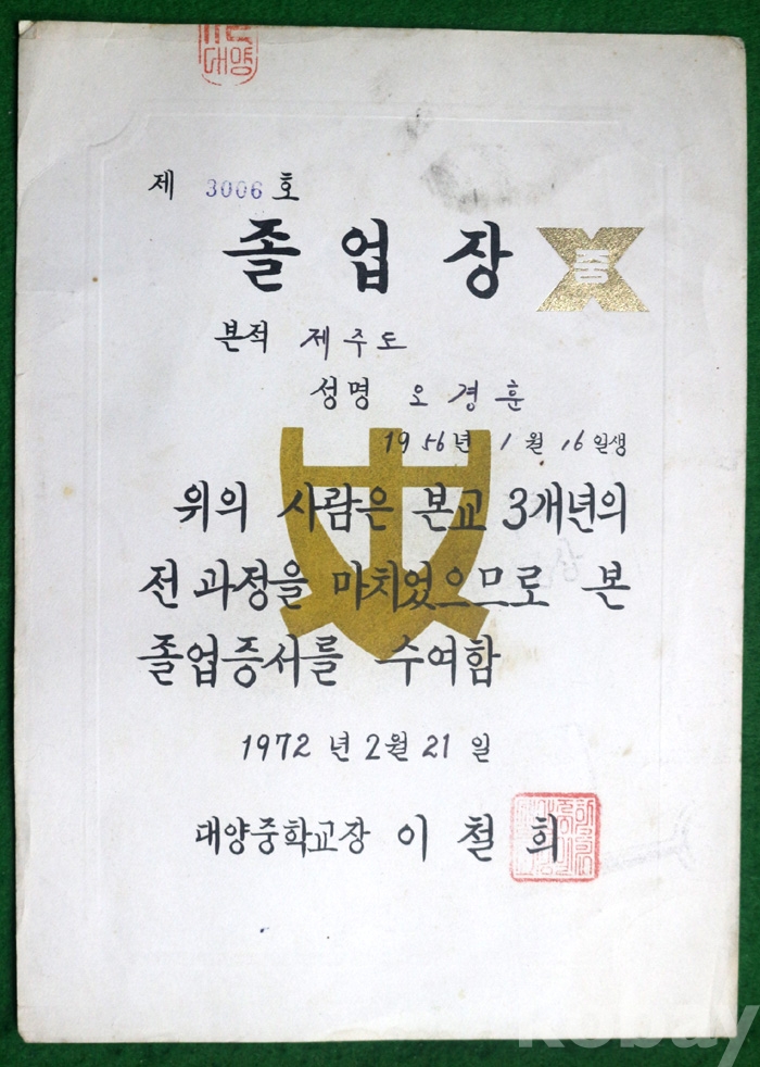 (상장 및 졸업장) 1972년 대양중학교의 졸업장