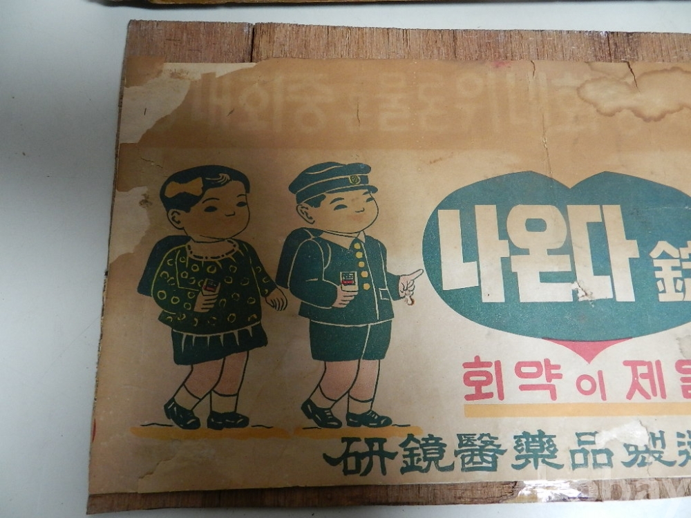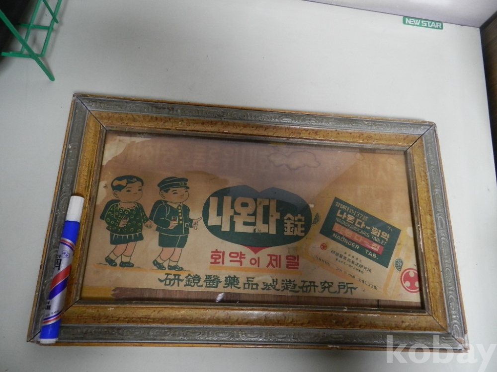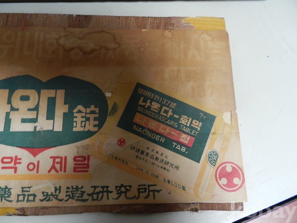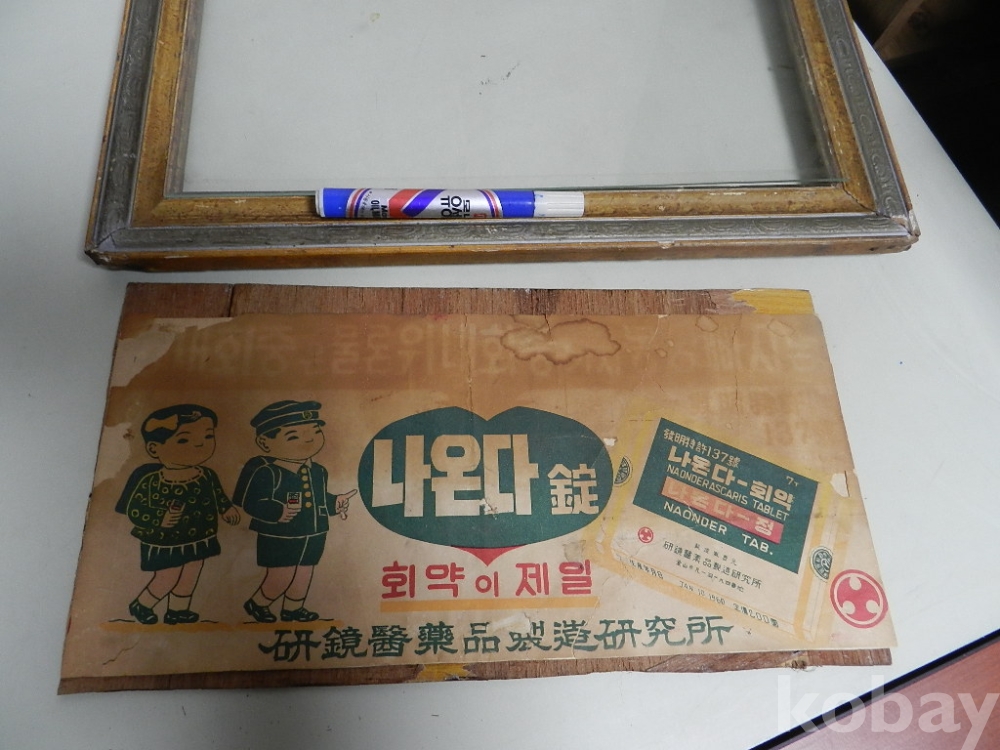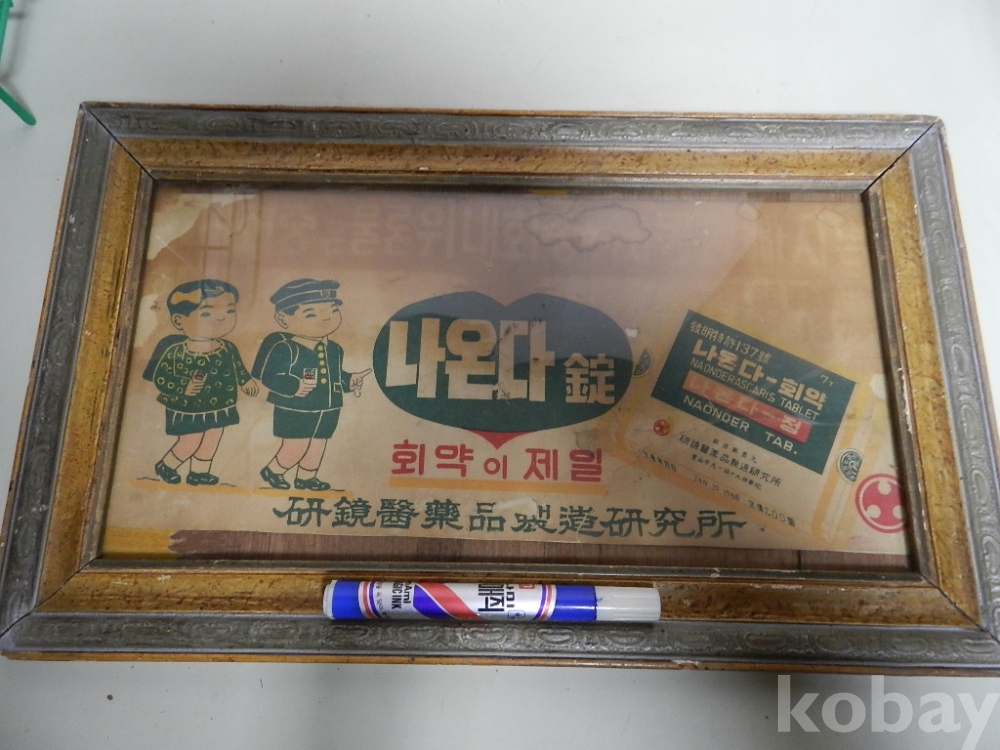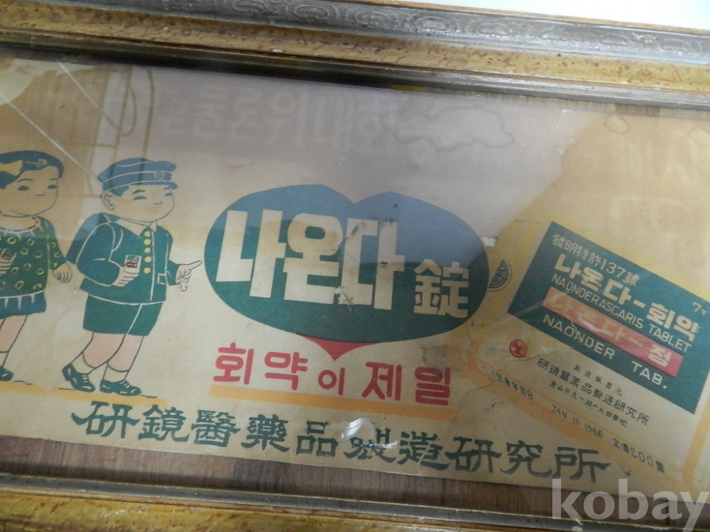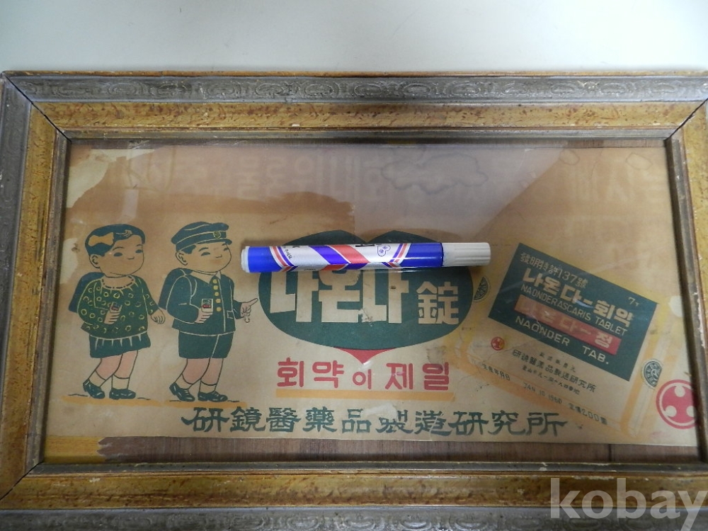 액자크기 가로 46cm 세로28cm 의 50-60년대 정도의 회충약 광고 입니다 카피 아닌 진본 으로 옛날 약국에 걸어 홍보용으로 사용했다고 합니다 사진 관계로 조심스럽게 뒷판열어 사진찍었고 옛날 종이라 사진처럼 헤짐.찟김.변색등 세월의 흔적 많이 있습니다 액자도 사용감있고 후에 교체된걸로 보입니다 구하기 어려운 자료로 의약 박물관이나 전시에 활용하면 재미있는 물품으로 보입니다 이미지 참고바랍니다