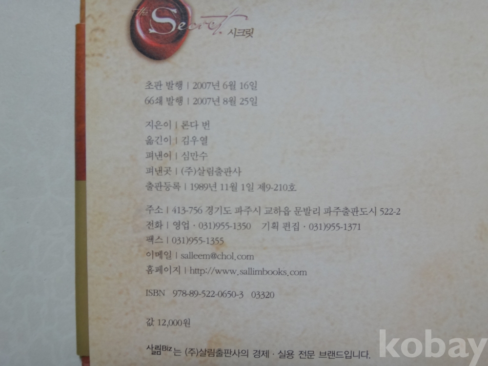 시크릿(비밀) - 수세기 동안 단 1%만이 알았던 부와 성공의 비밀 (2007년, 론다 번 저, 김우열 역, 살림출판사)