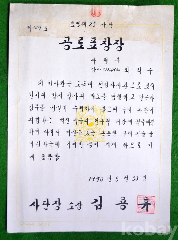 1970년 보병 25사단장 소장 김용휴장군이 준 공로표창장...