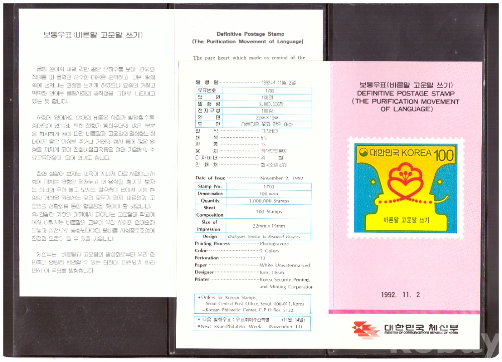(안내카드) 1992.11.2 보통우표(바른말 고운말 쓰기 100원) (접지않음)