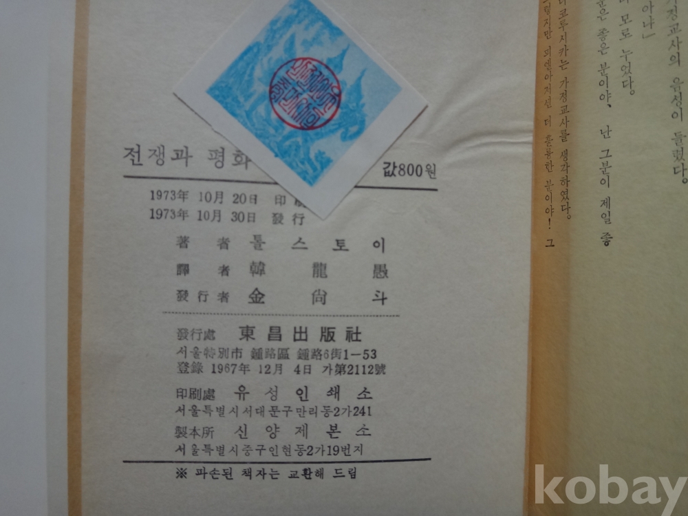 전쟁과 평화 - 톨스토이 (1973년, 동창출판사)