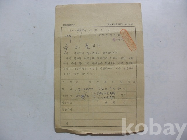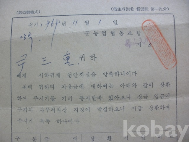 원금 및 통상이자 - 상환 안내 (1969년, 군농협)