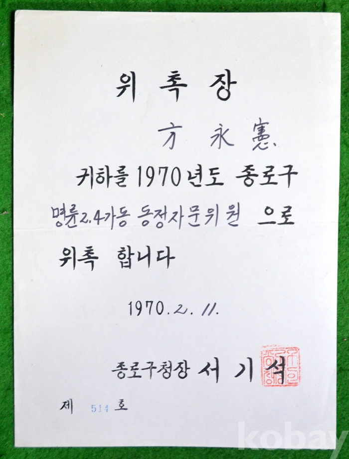 1970년 종로구청장의 위촉장 - 명륜동 2,4가동 동정자문위원...
