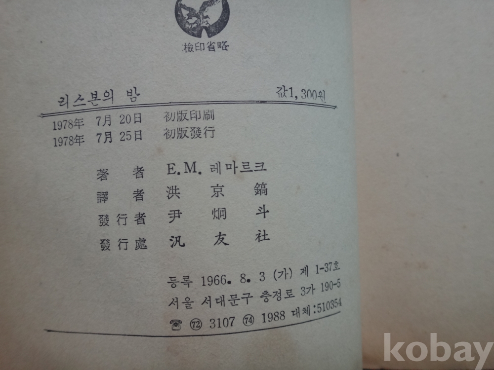 리스본의 밤 - 레마르크 저 (1978년, 범우사)