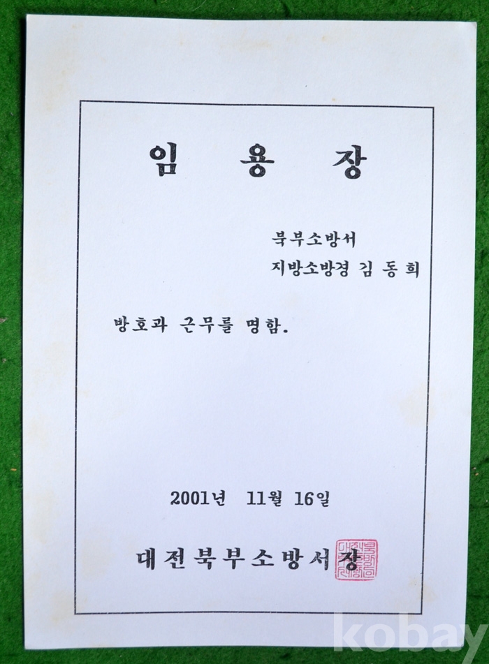 2001년 대전북부소방서장의 임용장 - 방호과 근무를 명함
