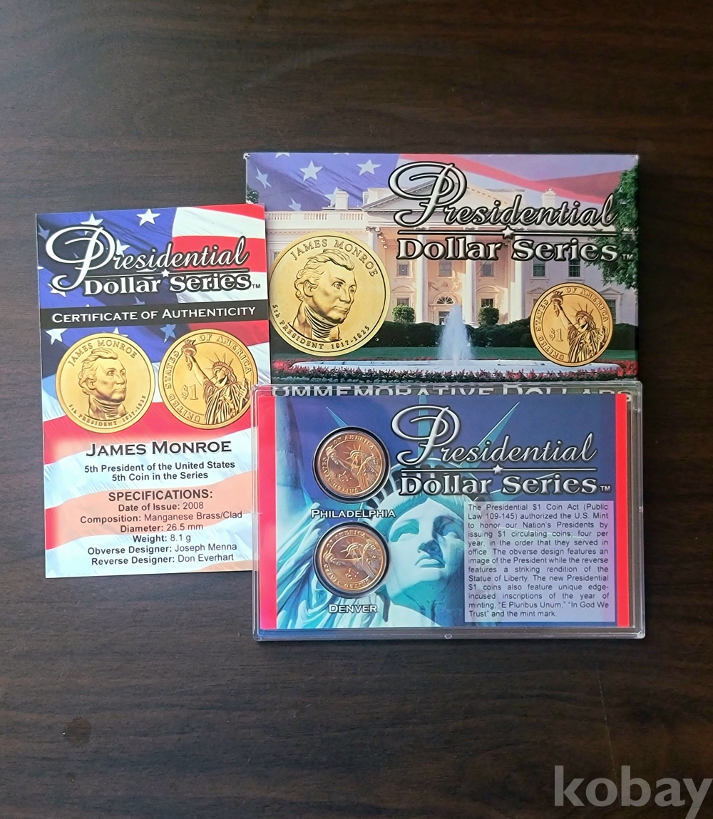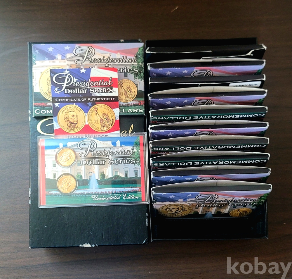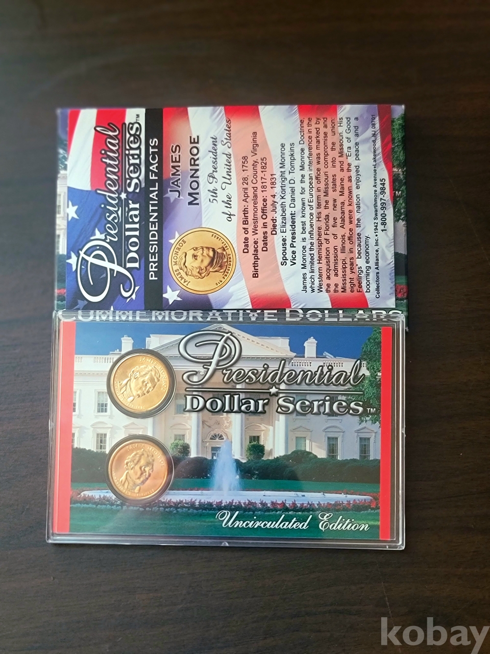 사진과같이 역대 president 시리즈 발행된 첫번째 프로젝트 발행 금도금 1dollars 세트로 발행된 희귀 민트 22종 1케이스당 2개의 주화가 준 입체형 슬립주화(메달)세트로 있습니다