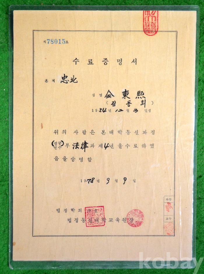 (상장 및 졸업장) 1978년 법정학회 부설 법정통신대학교육원의 수료증명서...