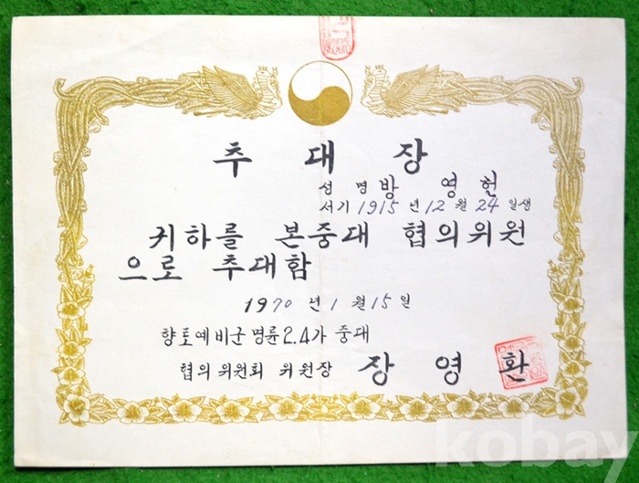 1970년 향토예비군 명륜2,4가 중대의 추대장 - 중대 협의위원...