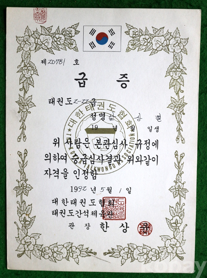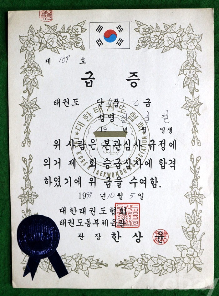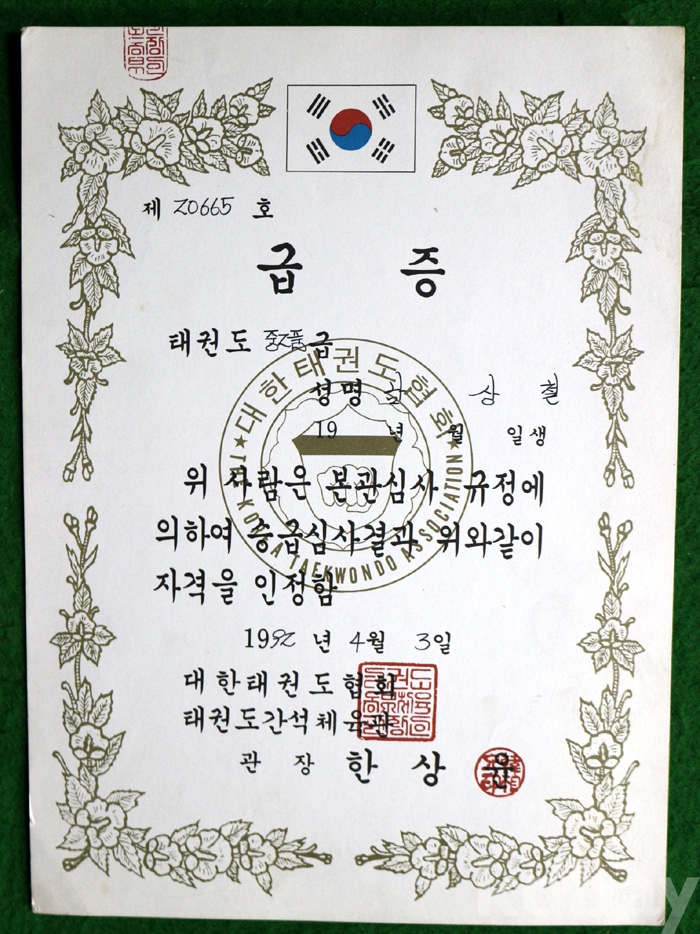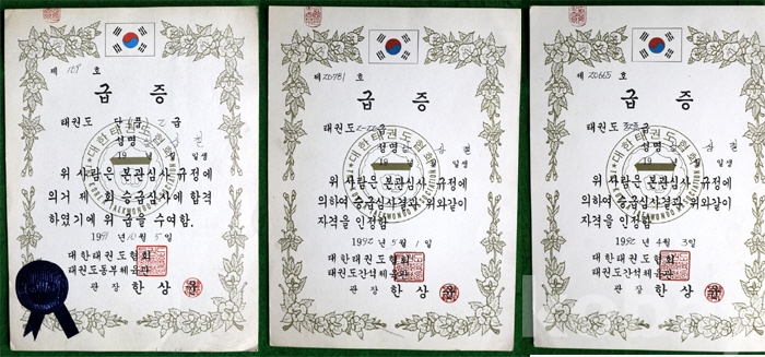 1991년. 92년 대한태권도협회의 급증 3점 - 중2품/ 1품2급...