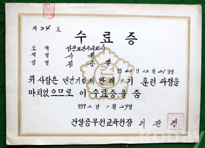 (상장 및 졸업장) 1972년 건설공무원교육원의 수료증 - 민간기업체반 제1기 훈련과정