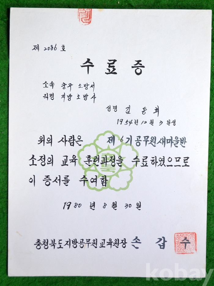 1980년 충청북도 지방공무워 교육원의 수료증 - 제6기 공무원새마을반...