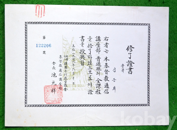 1976년 한국루터교선교회의 수료증서 1점 - 기독교통신강좌부 보통반수료