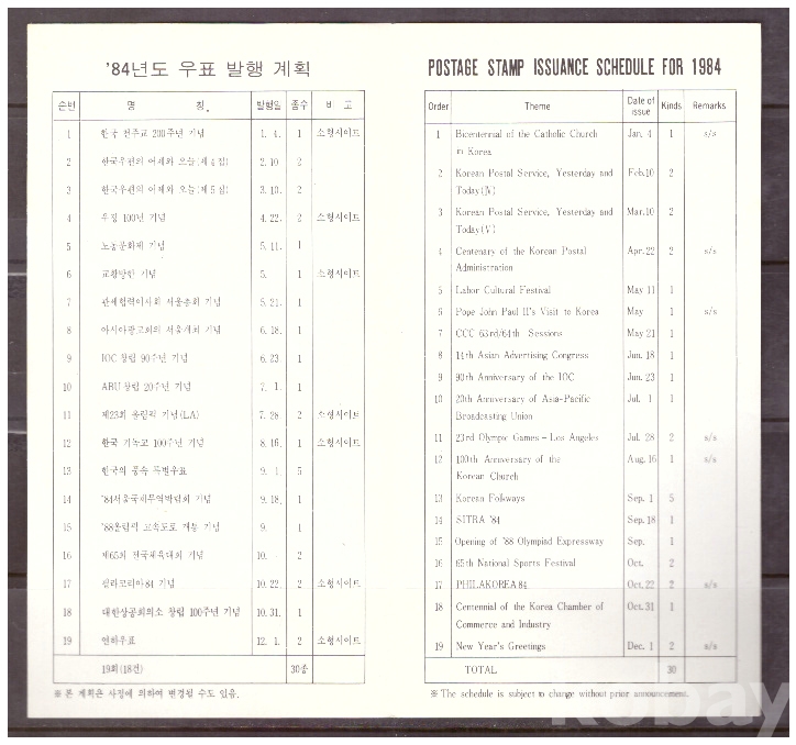 (안내카드) 1984년도 우표발행계획 (가운데접음)