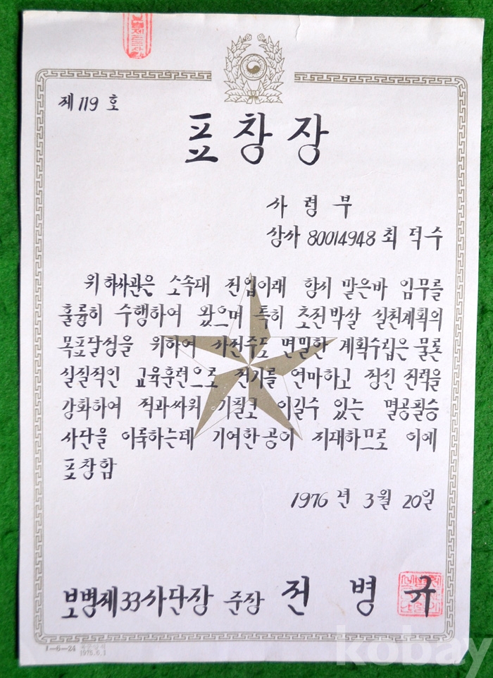 1976년 보병 33사단장 준장 전병규장군이 준 표창장 - 초전박살 실천계획 목표달성...