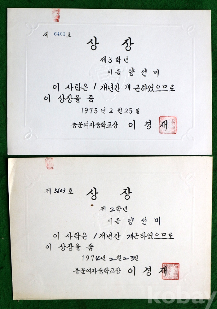 (상장 및 졸업장) 1974/ 75년 풍문여자중학교의 1개년 개근상장 2매