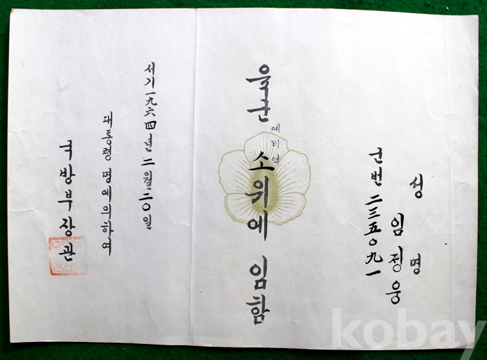 (상장 및 졸업장) 1964년 국방부에서 준 육군 예비역 소위의 임명장