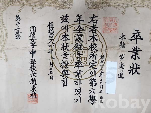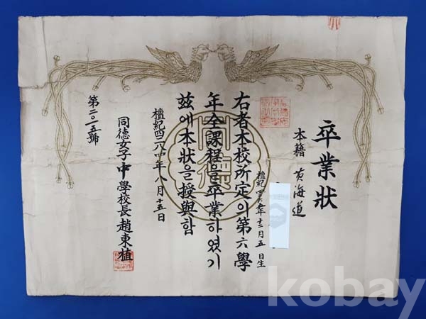 **** 1951년 8월 15일 동덕여자중학교 졸업장 / 뒷면 일부 배접함