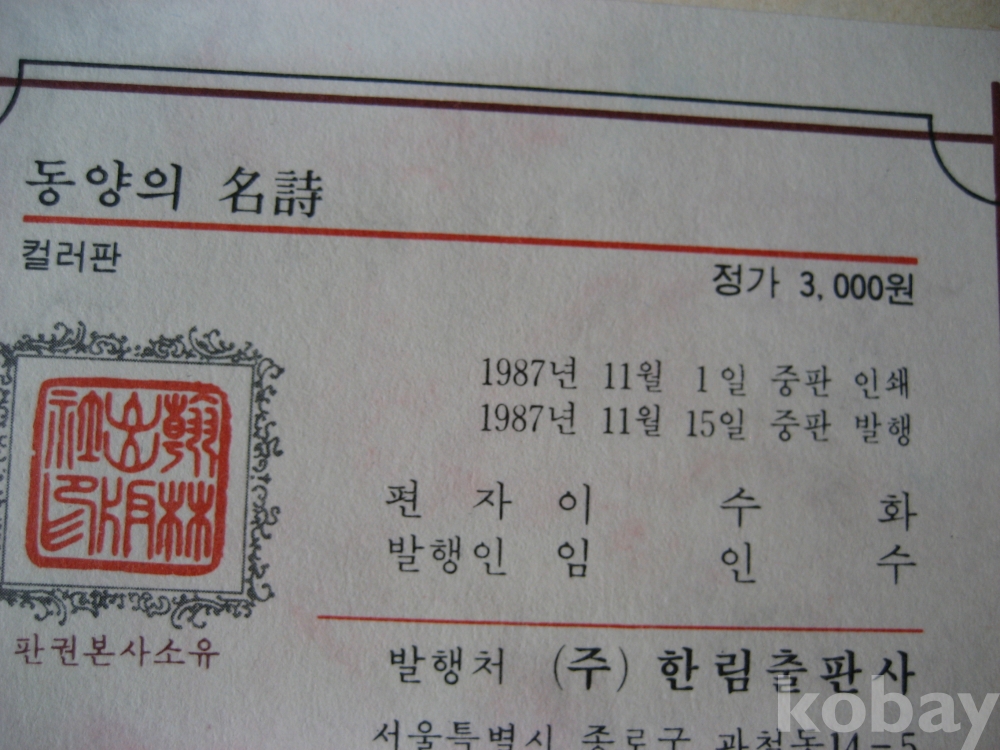 동양의 명시 ,,,하드카바,,,이수화 편자,,,87년