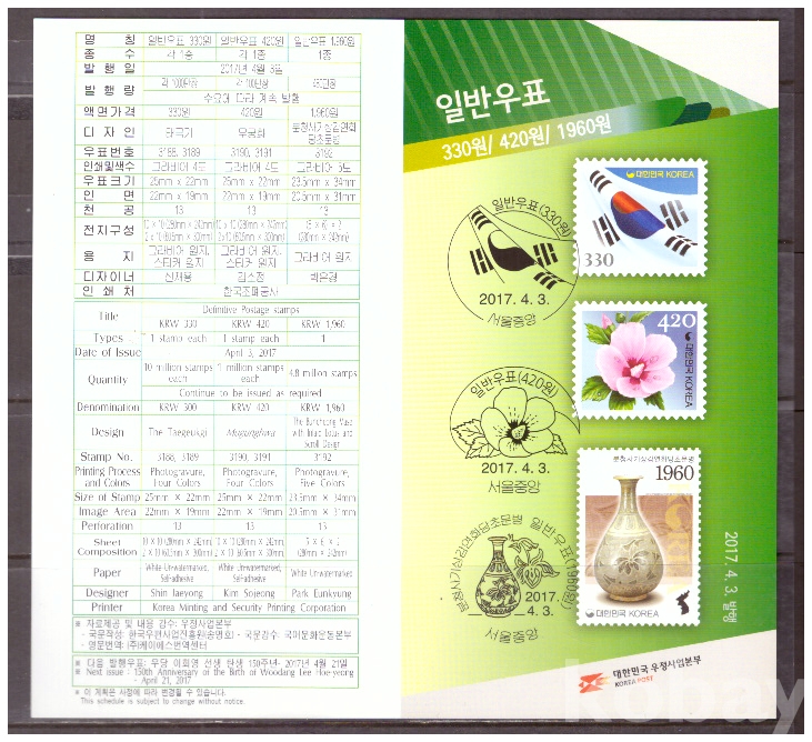 (안내카드) 2017.4.3 일반우표(330원,420원,1960원) (접지않음)