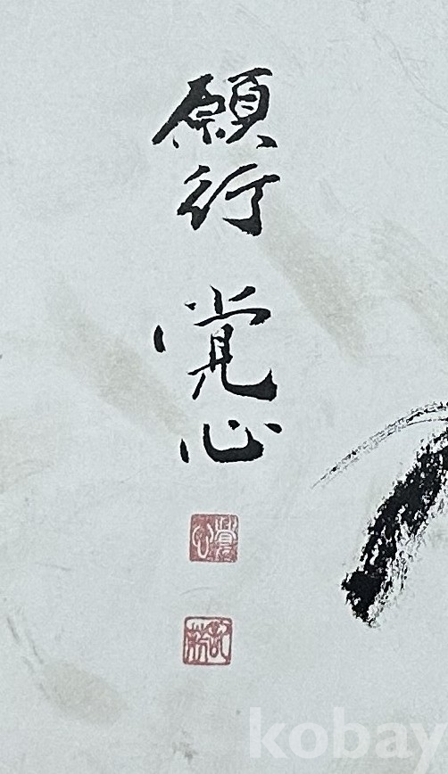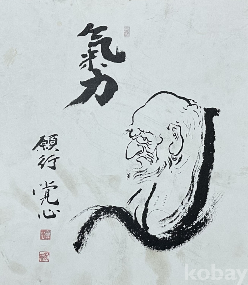 묵직한 선과 기운 있는 필치로 그려낸 이 달마도는 불교 선종의 시조 보리달마를 상징적으로 표현한 작품으로, 단순한 인물화를 넘어 정신성과 수행의 철학을 함께 담고 있습니다. 흐르듯 이어지는 검은 선은 달마의 도포를 상징하며, 날카롭고 깊게 패인 이목구비에는 생의 통찰과 고요한 지혜가 깃들어 있습니다. 그림 왼편에 쓰인 ’기력(氣力)’이라는 글씨는 정신적 활력과 강한 내면의 힘을 의미하며, 아래쪽의 ’경행각심(傾行覺心)’은 몸을 기울여 수행하며 마음을 깨우친다는 의미로, 불교 수행자의 자세를 상징적으로 보여줍니다. 화면에는 두 개의 낙관이 함께 찍혀 있으며, 수묵의 농담과 여백의 조화 속에서 진중한 기운이 절제되어 흐르고 있어 전통 달마도의 미감을 잘 간직한 수작입니다. 소형 사이즈로 부담 없이 감상할 수 있는 크기이면서도, 작품이 전하는 상징성과 에너지는 결코 작지 않으며, 공간에 기운과 의미를 더해주는 동양화로서 추천할 만한 작품입니다.