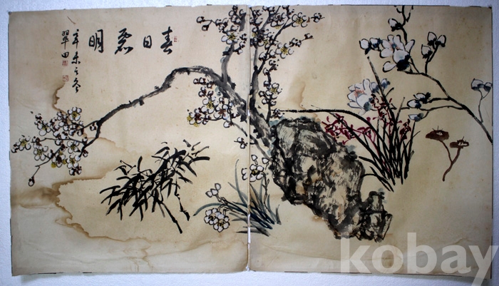翠田 (취전) 김명임의 2폭 대련작품 - 괴석과 난초. 대나무. 매화와 목련