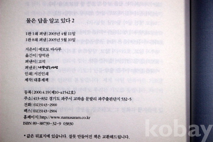 물은 답을 알고 있다 2권 : 물이 전하는 놀라운 메시지 / 물의 결정이 연주하는 치유와 기도의 멜로디- 에사토 마사루 著. 양억관 옮감 /2003년. 나무심는 사람 발행