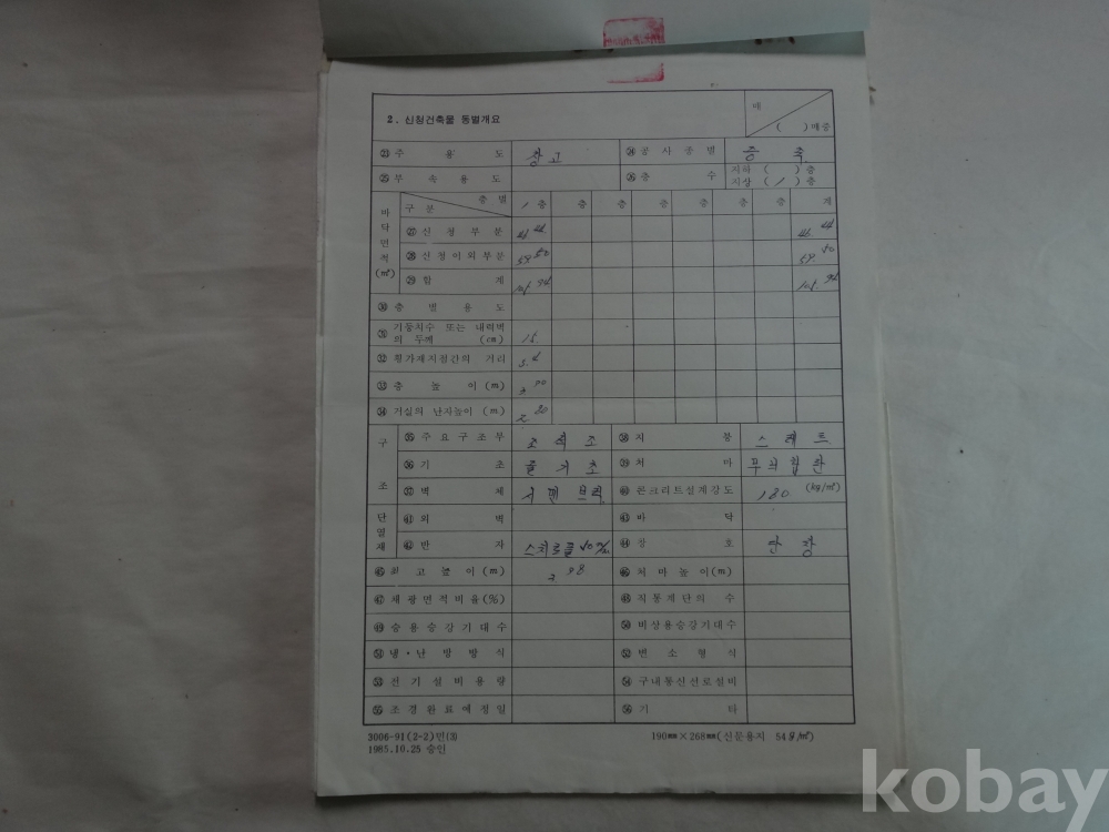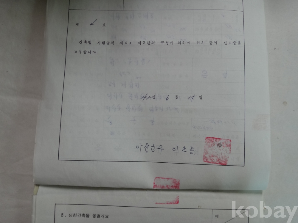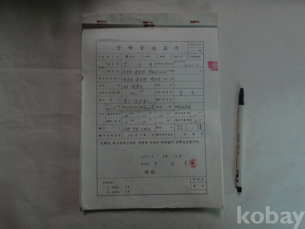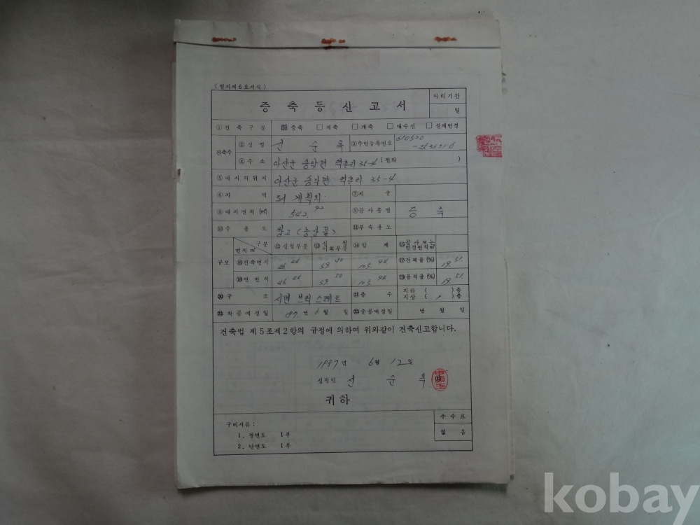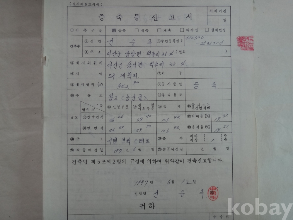 증축 등 신고서 - 창고, 농산물 (1987년, 아산군수)