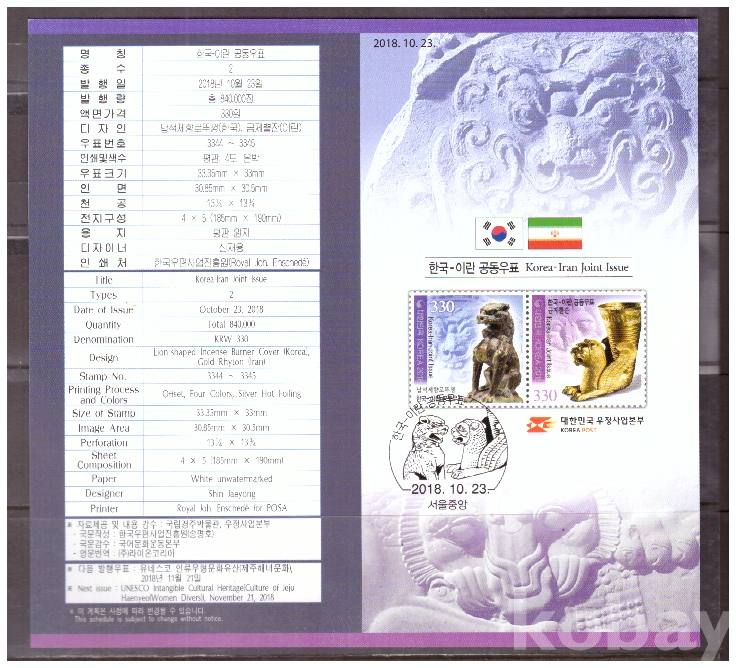(안내카드) 2018.10.23 한국-이란 공동우표 (접지않음)