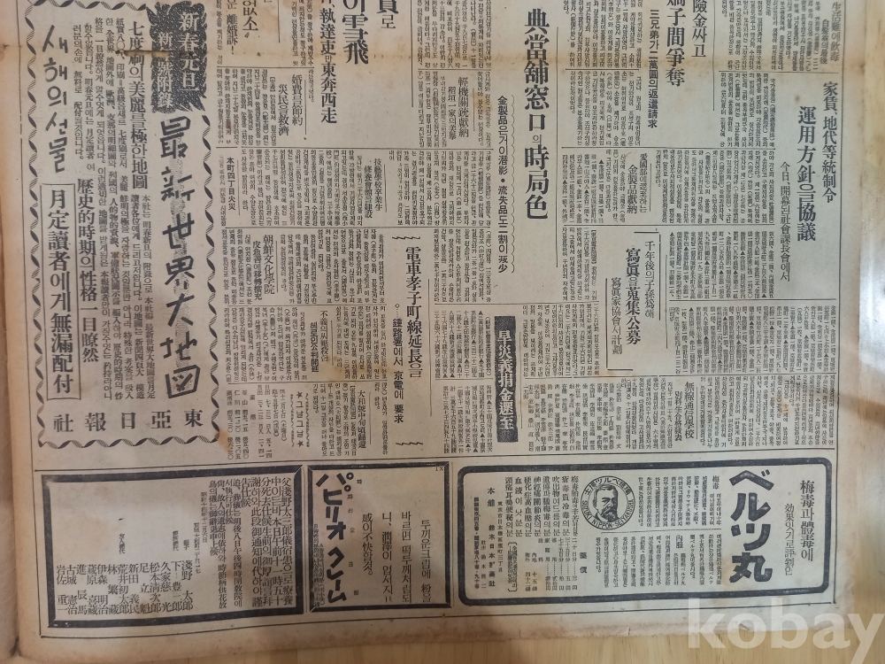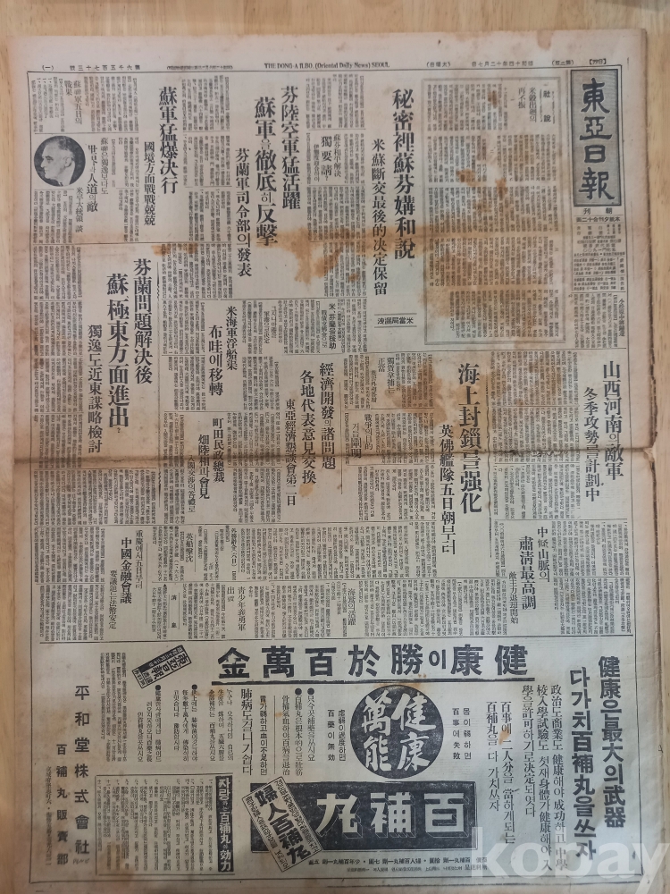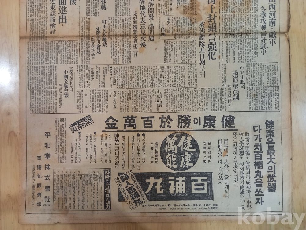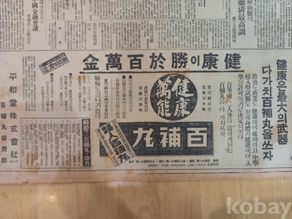1면: 하단 광고 <건강이 승어백만금- 백보환..건강은 최대의 무기 다가치백보환을 쓰자..평화당주식회사 >