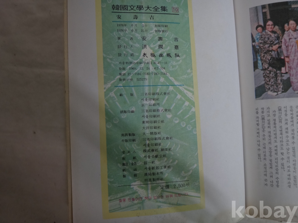 (한국문학대전집) 안수길 (1976년 초판, 태극출판사)