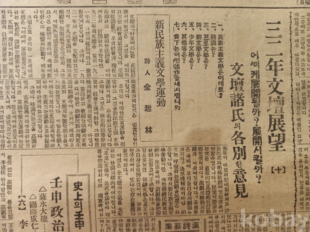 5면: 상단 중앙에 <32년 문단전망-어떻게 전개될까? 전개시킬까?(10)> 시인 김기림의 <신민족주의문학운동> 기고문....