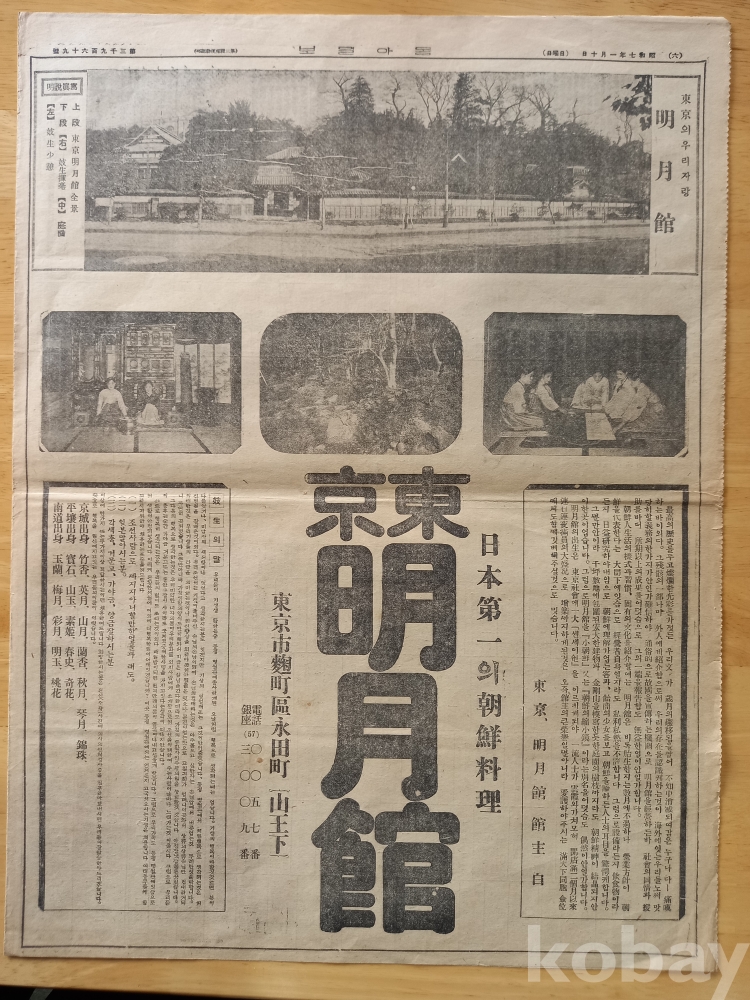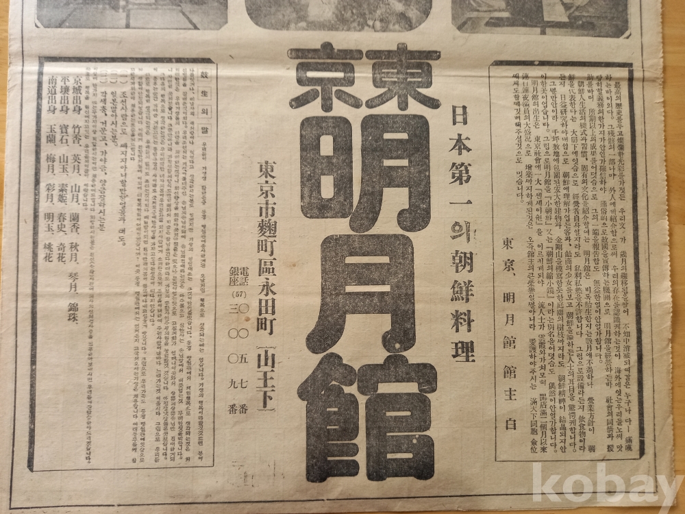 6면: 전체에 대문짝만하게 동경에 연 명월관 사진4장과 광고<동경의 우리자랑 명월관-일본제일의 조선요리 동경 명월관-동경시...>와 <주인의 말>, <기생의 말>과 기생명단 등 자세하게...