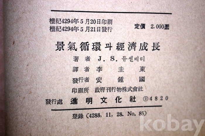 (교과서) 경기순환과 경제성장 - 듀센베리 著. 이규동 譯 / 1961년. 진명문화사 발행