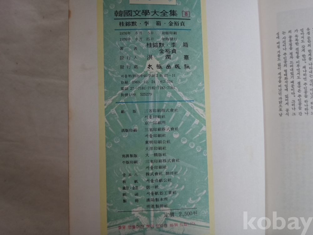 (한국문학대전집) 김유정, 이상, 계용묵 (1976년 초판, 태극출판사)