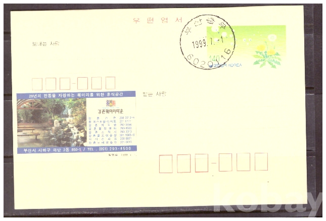 (광고엽서) 1999.7.1 지방판 LAPC262 강촌훼미리타운 (민들레 140원) (초일일부인)