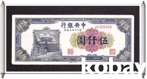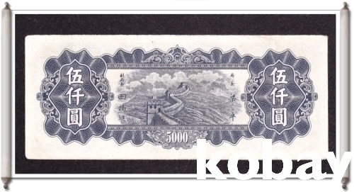 - 중국중앙은행에서 1949년 발행한 5.000원권 지폐입니다