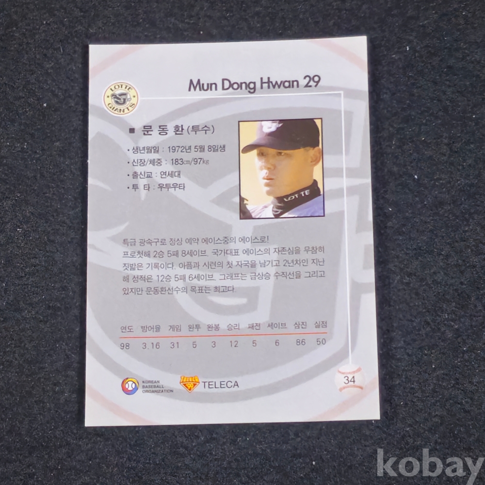 (((프로야구자료))) 1998년 롯데자이언츠 투수 문동환 스포츠 카드 (KBO/TELECA)