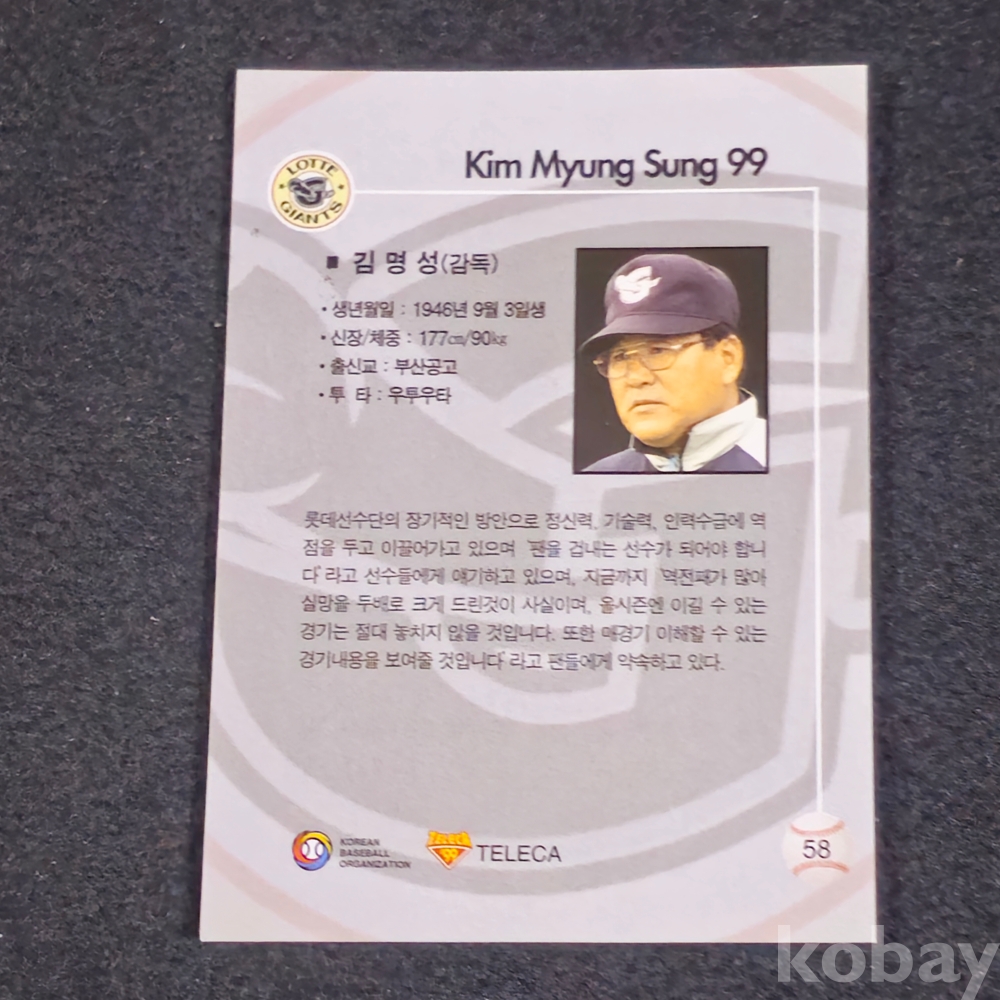 (((프로야구자료))) 1998년 롯데자이언츠 감독 김명성 스포츠 카드 (KBO/TELECA)