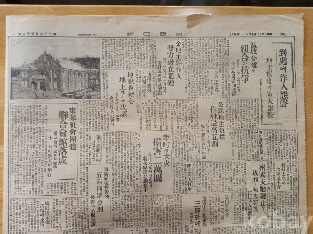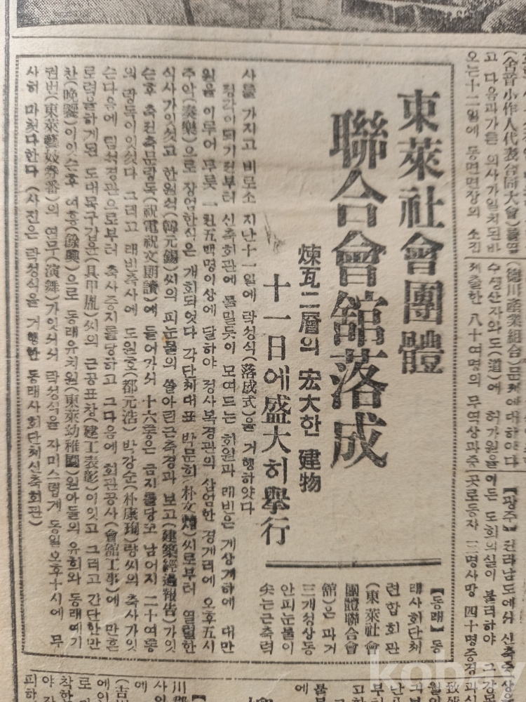 4면: 좌측에 <동래사회단체 연합회관낙성-연와2층의 굉대한 건물, 11일에 성대히 거행>이란 기사와 사진.. 내용에 낙성식 순서 중 <..축사...임석경관으로부터 축사중지를 당하고> 운운...