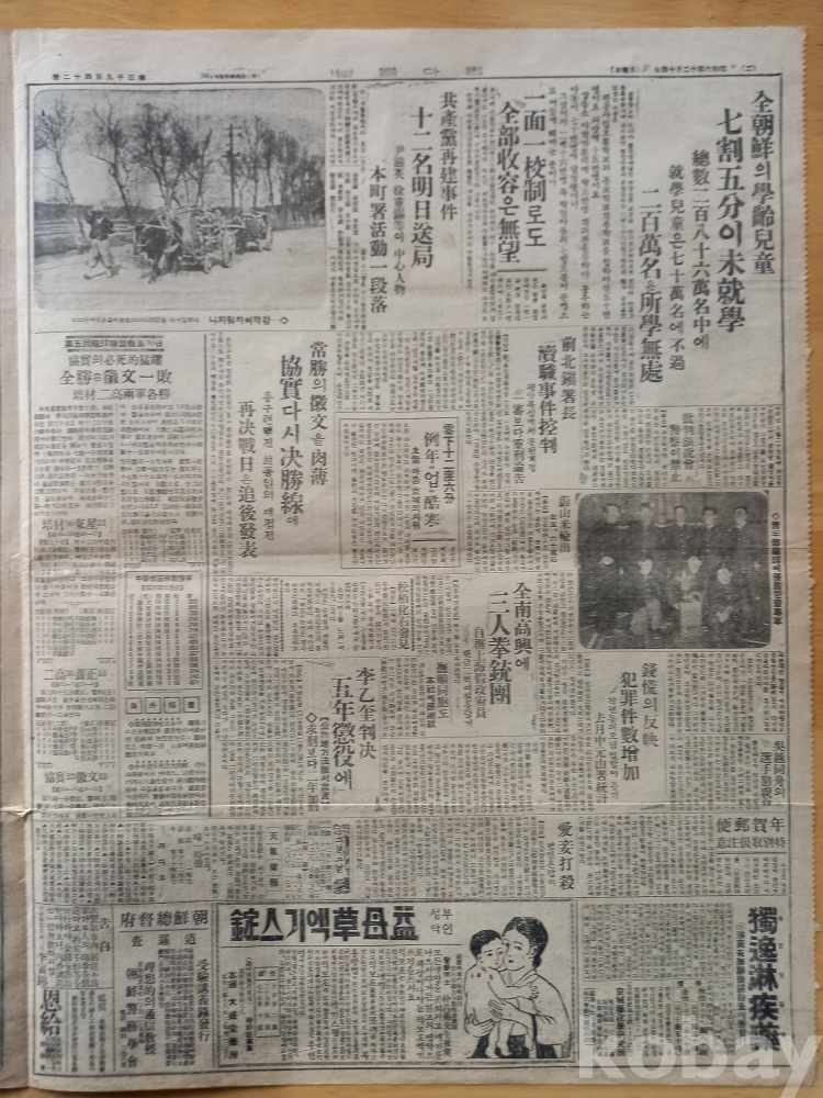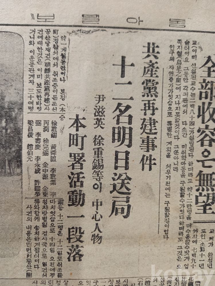 2면: 상단 중앙에 <공산당재건사건 12명 명일송국- 윤자영 서중석 등이 중심인물. 보정서활동 일단락>이란 기사에 <조선 공산당 재건사건에 대한 보도>...
