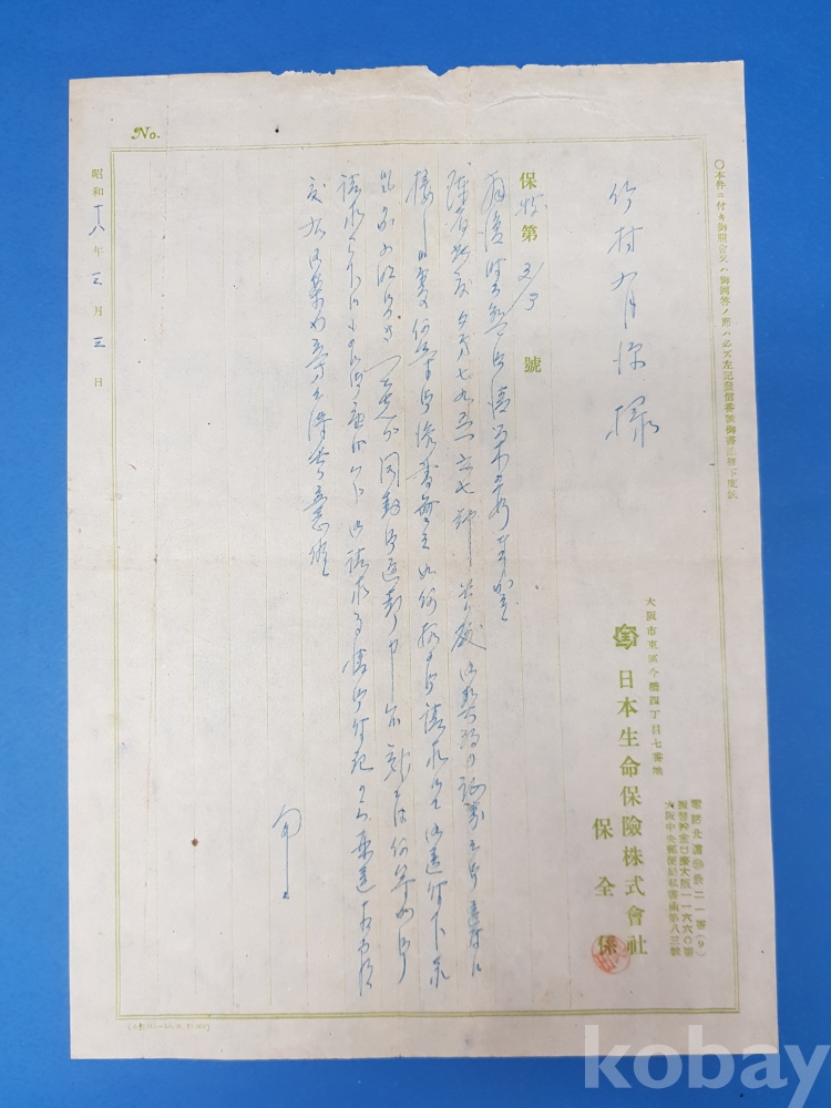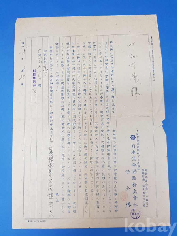 **** 1943년 일본생명보험(주) 안내문 2부, 봉투 등
