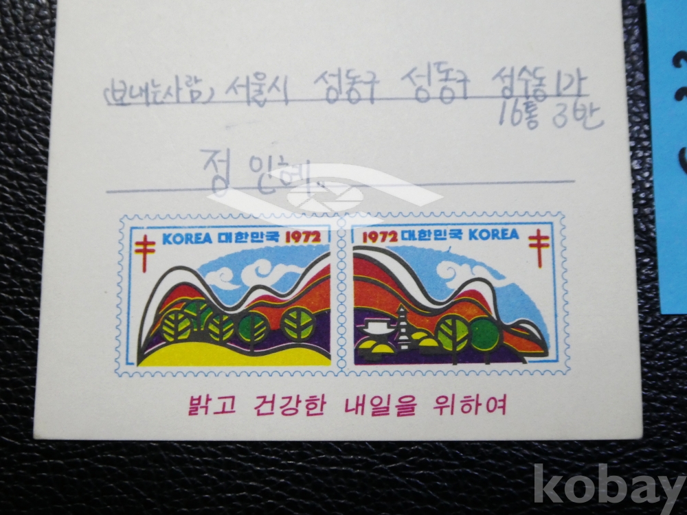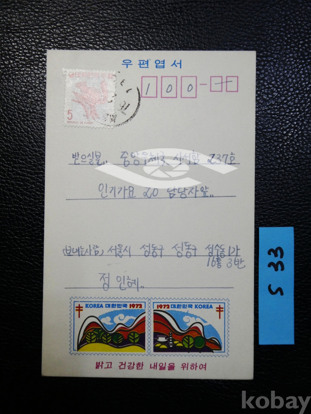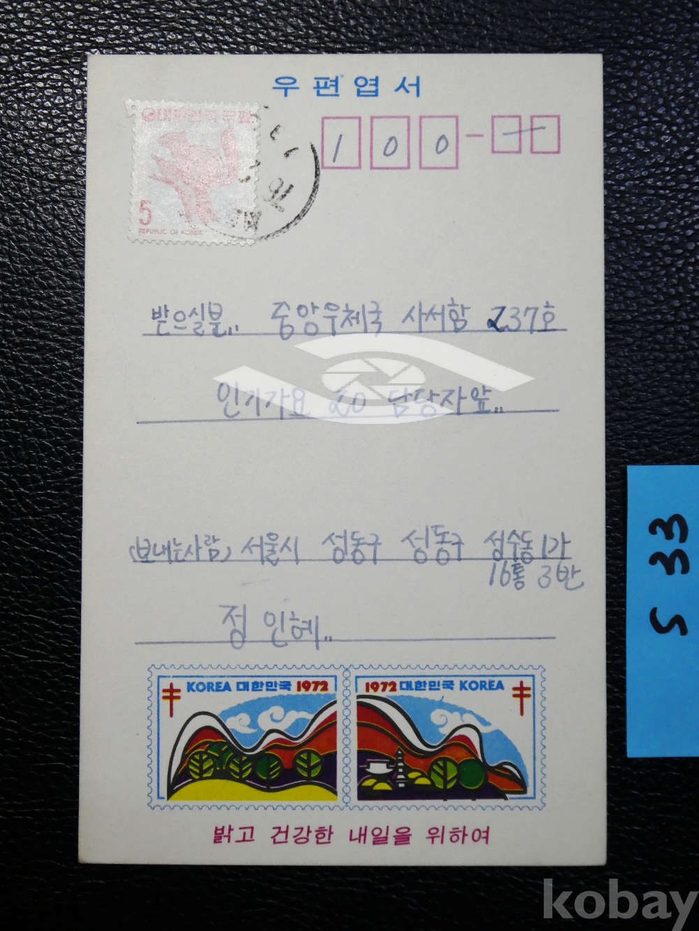 ▣1972년 크리스마스 씰 <아름다운 풍경>의 씰 엽서 사용 실체, S33