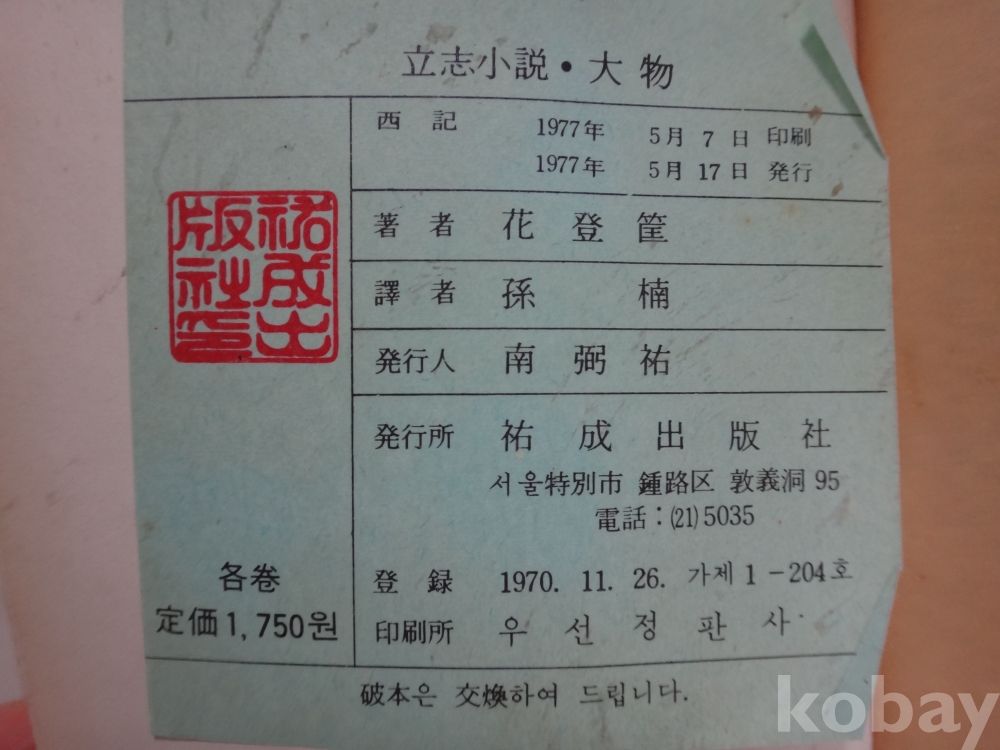 (입지소설) 대물 (1977년, 화등광 저, 우성출판사)